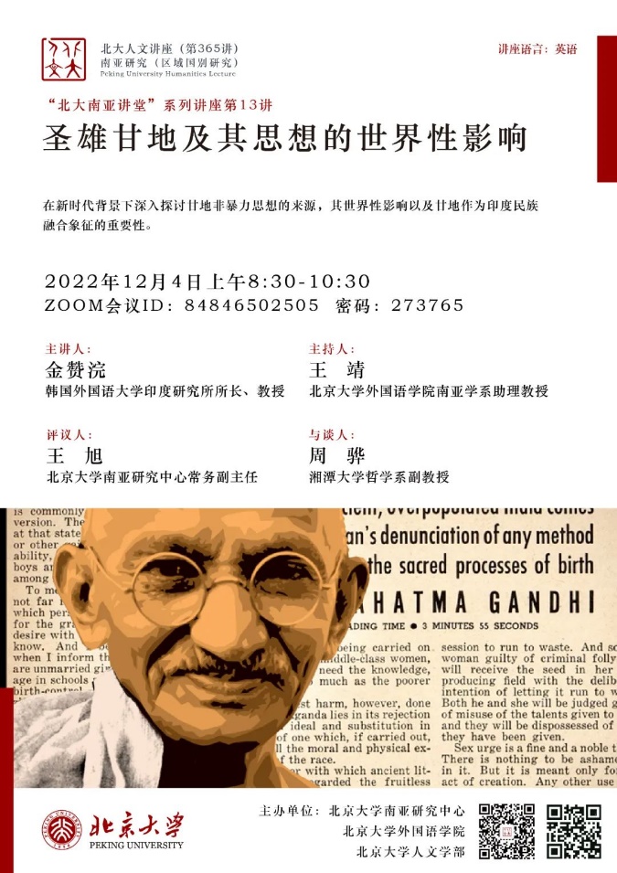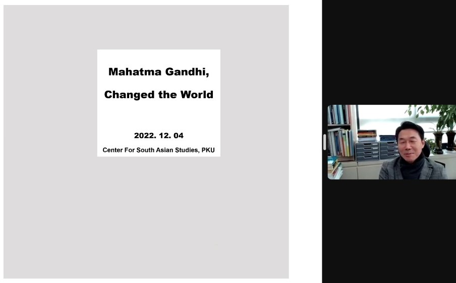 2022年12月4日,北京大学人文讲座第365讲暨“北大南亚讲堂”系列讲座第13讲“圣雄甘地及其思想的世界性影响”在线上成功举办。本次讲座由北京大学南亚研究中心、中欧电竞、北京大学人文学部主办。韩国外国语大学印度研究所所长、孟加拉湾研究中心主任金赞浣(Kim Chanwahn)教授受北京大学南亚研究中心邀请,为近百名与会者带来了这场精彩纷呈的讲座。本讲座由中欧电竞南亚学系助理教授王靖主持,北京大学南亚研究中心常务副主任王旭担任评议人,湘潭大学哲学系副教授周骅受邀与谈。