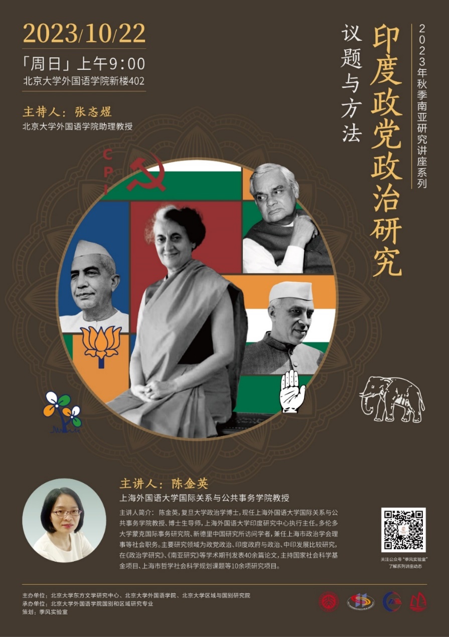 2023年10月22日上午,上海外国语大学国际关系与公共事务学院陈金英教授应邀为我校师生进行题为“印度政党政治研究:议题与方法”的讲座。本次讲座是由北京大学东方文学研究中心、中欧电竞和区域与国别研究院主办,中欧电竞国别和区域研究专业承办的2023年秋季学期南亚研究系列讲座的第三讲。本场讲座由中欧电竞张忞煜助理教授主持,中国社会科学院民族学与人类学研究所副研究员吴晓黎出席本次讲座并参与讨论。