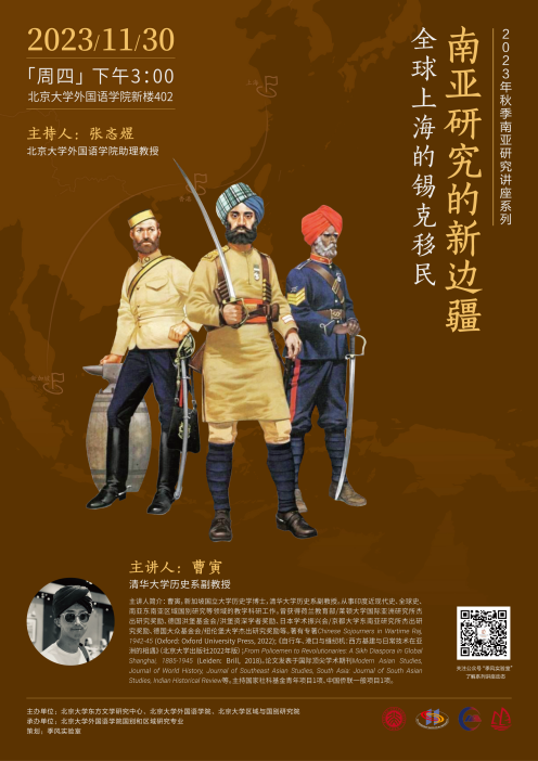 2023年11月30日,清华大学历史系副教授曹寅老师应邀为我校师生进行题为“南亚研究的新边疆——全球上海的锡克移民”的讲座。本次讲座是由北京大学东方文学研究中心、中欧电竞和区域与国别研究院主办,中欧电竞国别和区域研究专业承办的2023年秋季学期南亚研究系列讲座的第四讲。讲座由中欧电竞张忞煜助理教授主持,中欧电竞谢侃侃助理教授出席本次讲座并参与讨论。