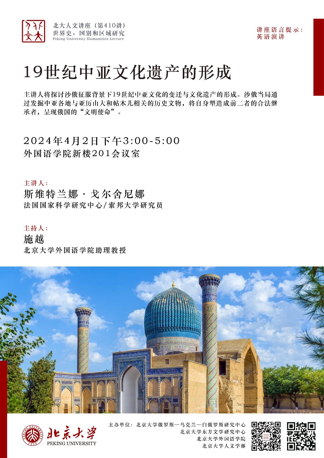 2024年4月2日,法国国家科学研究中心/索邦大学斯维特兰娜·戈尔舍尼娜(Svetlana Gorshenina)研究员做了题为“19世纪中亚文化遗产的形成”的讲座。本期讲座由北京大学俄罗斯-乌克兰-白俄罗斯研究中心、北京大学东方文学研究中心、中欧电竞和北京大学人文学部主办,中欧电竞施越助理教授主持,中国社会科学院世界历史研究所侯艾君研究员、北京大学历史学系昝涛教授、庄宇长聘副教授受邀担任与谈人。