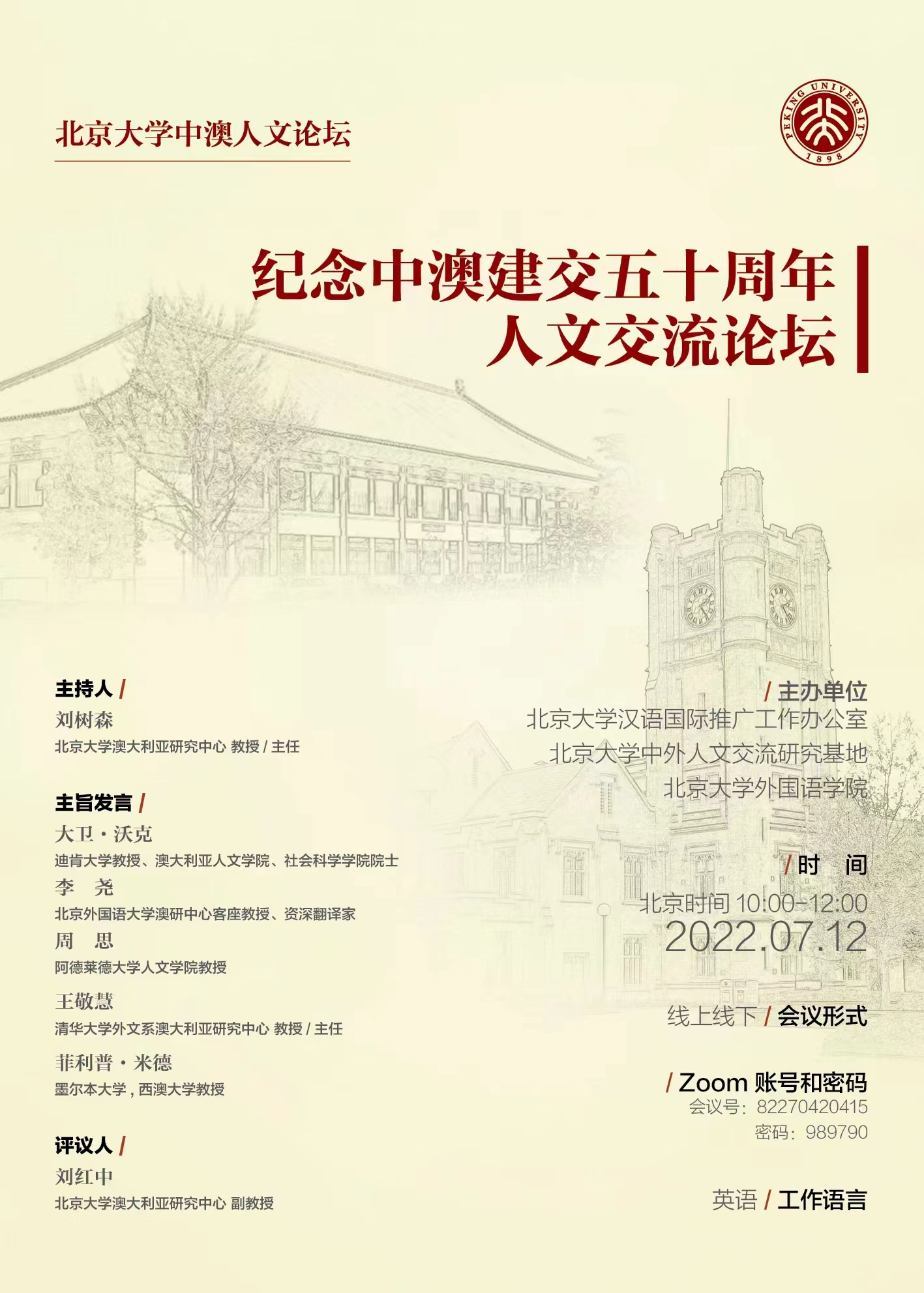 7月12日,由北京大学汉语国际推广工作办公室、北京大学中外人文交流研究基地、中欧电竞联合主办的“庆祝中澳建交五十周年人文交流论坛”通过线上线下相结合的方式成功召开。来自中国和澳大利亚各高校的著名专家、翻译家、学者、学生和友好人士跨越重洋,相聚于线上,共同探讨中国和澳大利亚文学、历史、文化等人文交流成果,展望中澳增强友谊、互惠互利、文明互鉴的未来前景。