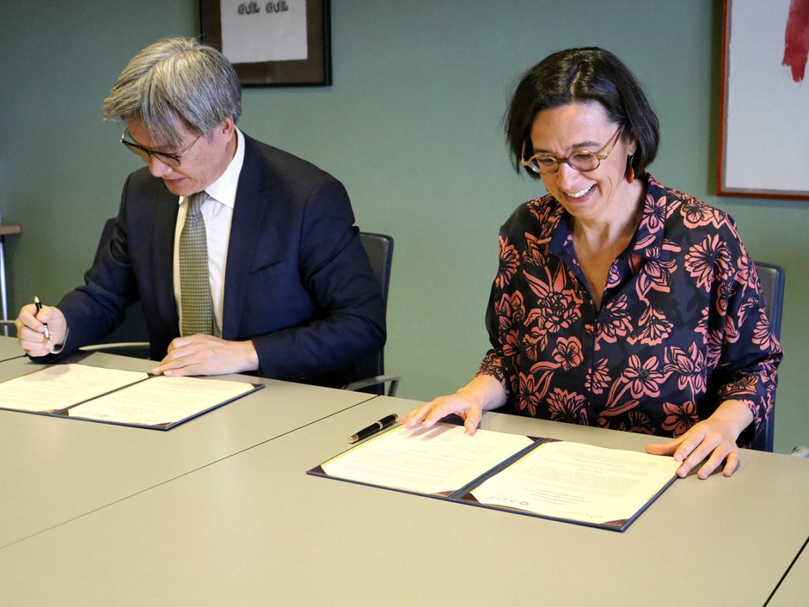 3月22日下午,代表团首先前往马德里自治大学。王博与该校副校长Irene Martín续签学生交换协议,与国际合作部部长Matilde Delgado、新任马自大孔子学院外方院长Andreas Janousch、上任马自大孔子学院外方院长、东亚研究中心教授Gladys Nieto 进行交流。马德里自治大学建于1968年,2011年与我校签署校际协议,双方校长有两次互访。目前北大共派出学生69名,接收学生76名,双方学生均表示获益匪浅。