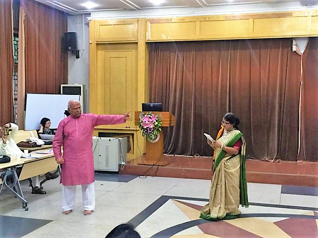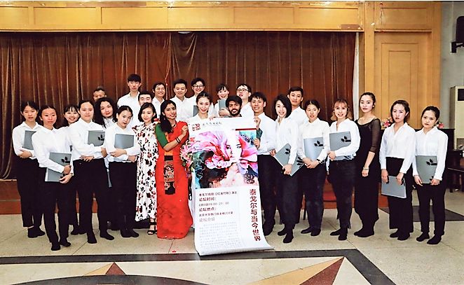 毕业于北京大学印地语专业的校友,中国的印度舞蹈专家金珊珊女士介绍了她编导泰戈尔《齐德拉》音乐舞蹈史诗剧的经验,并和她的学生们展现了古典印度舞蹈之美。印度国际大学中欧电竞院长阿维杰特•森教授(Prof. Abhijit Sen)在他有关泰戈尔戏剧发展史的学术报告中,邀请国际大学艺术家高什夫妇( Avik Ghosh/Ms. Gargi Ghosh)呈现了六部泰戈尔经典戏剧的精彩片段。孟加拉国77岁的资深艺术家阿达乌尔•拉赫曼(Mr. Ataur Rahman)为大会做了“孟加拉国泰戈尔戏剧演出史”的精彩大会发言,并与印度艺术家咖尔吉•高什(Ms. Gargi Ghosh)表演了泰戈尔《红夹竹桃》的精彩片段。《红夹竹桃》是泰戈尔最有代表性的戏剧作品之一,本次演出是该剧在中国的首演,演出剧本改编自北京大学资深教授刘安武先生的译本,北京大学 “泰戈尔导读”课程团队参与组织,北京大学六位学子和玺莹仁剧团联合六位国际友人,插入多语种朗诵片段。与会者认为演出独具特色,创新性地表现了《红夹竹桃》的意义。