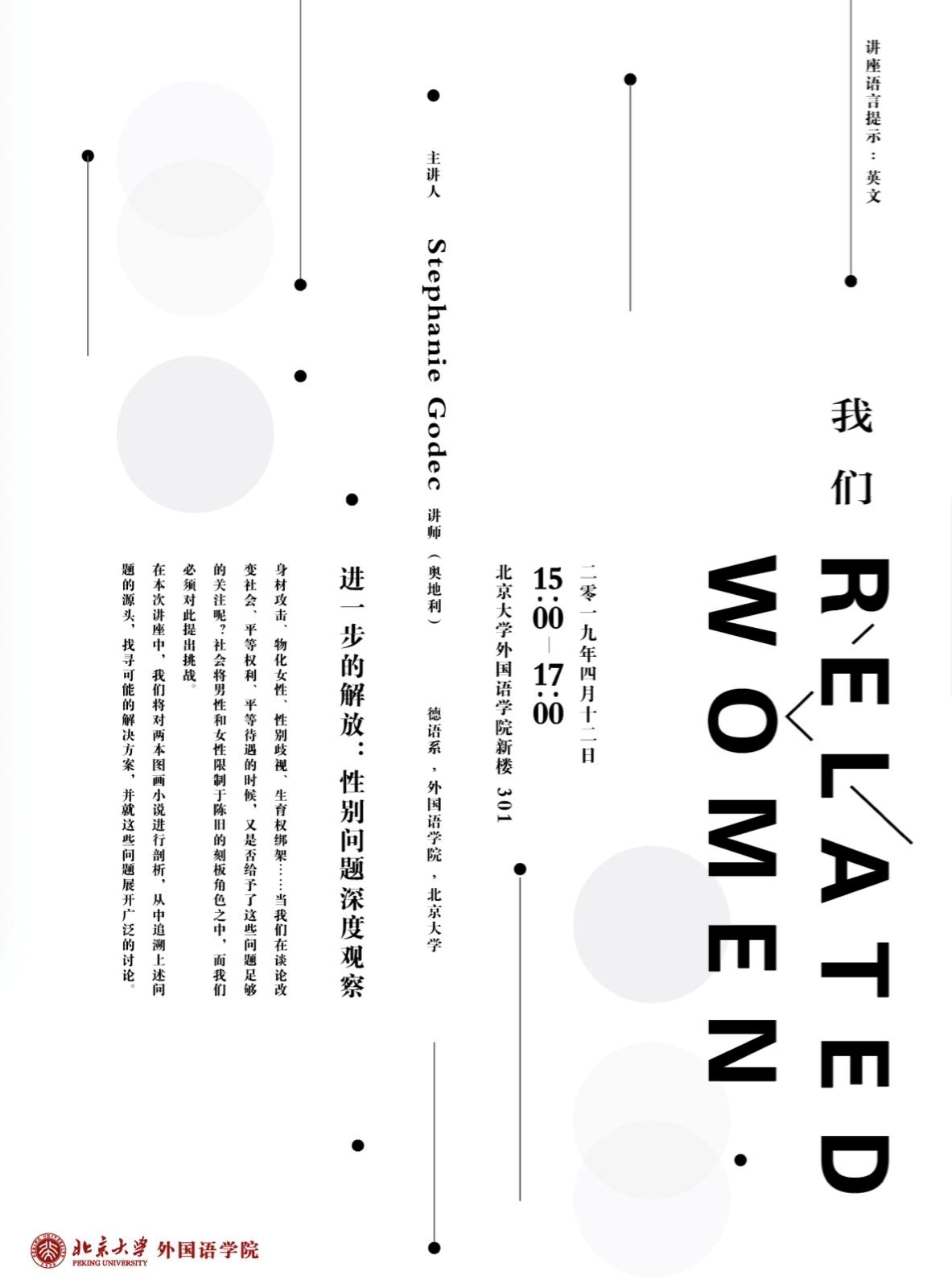 “我们-Wǒmen-Related”专题系列讲座由中欧电竞德语系外籍讲师Stephanie Godec发起和策划,从女性视角出发,关注不同群体中、不同角度下的女性问题。本系列讲座规划开展三场讲座及一场主题讨论活动。2019年4月12日下午,系列第一讲在外院新楼301会议室举行,本场讲座主题为《进一步的解放:性别问题深度观察》,由发起人Stephanie Godec主讲。