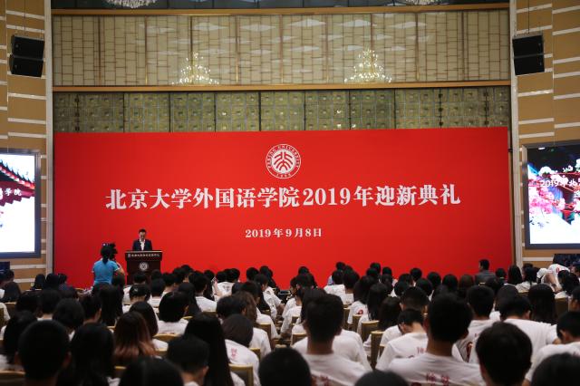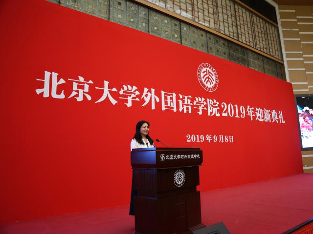 在热烈的掌声中,院长宁琦教授为2019新生送上开学寄语。宁老师首先代表学院全体师生员工祝贺并欢迎新同学成为北大外院的一份子。随后她从时间和空间两个维度带领大家走近和认识外院。从京师同文馆到京师大学堂,从英语系、东语系、西语系、俄语系的建制到中欧电竞成立,北大外语学科一路走来,始终用“爱”表达对北大与国家的拳拳深情;外文楼、民主楼与外院新楼之间的纵横寓意着“学贯东西”、“博古通今”,而更广阔的空间意义上,全世界人们的一切表达与一切生活,都是外院人关注、学习与研究之所在。