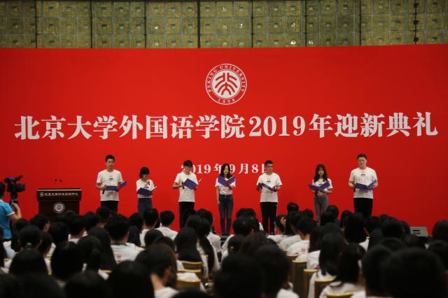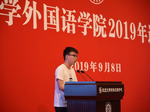 2019级英语系本科生郭若菲代表本科新生发言。她认为,正是因为向上的信念,大家才能在燕园里相遇,共同书写青春故事。她表示,新一代的外院人将传承前辈们的辉煌火炬,像一代代外院人一样以语言为舟楫,架起文化沟通的桥梁,完成时代赋予北大外院人的使命。