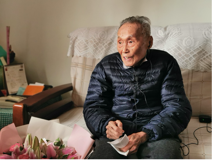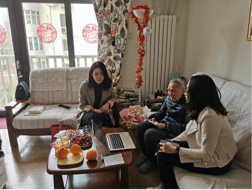 探访当天早上,殷洪元老师刚到医院做完例行治疗回到家,身体稍感疲惫,但同学们仍然受到了热情接待。在专题访谈中,当同学们问起老师为什么在如此高龄还要申请入党、与党之间有哪些特殊的故事时,殷老师从三方面深情地讲述了自己的入党初心。首先,殷老师的姐姐曾经是一位上海中共地下党员,她对殷老师产生了很大的影响。其次,在求学期间,殷老师就读于国立东方语言专科学校,由于学校和南京中央大学距离很近,殷老师受到了许多当时南京中央大学的进步青年的影响,学习了很多先进的新思想。最后,2020年,他看到在抗击新冠疫情和脱贫攻坚中党发挥的重要作用,再次意识到了党的先进性和纯洁性,因此决定郑重地向党组织提出入党申请。