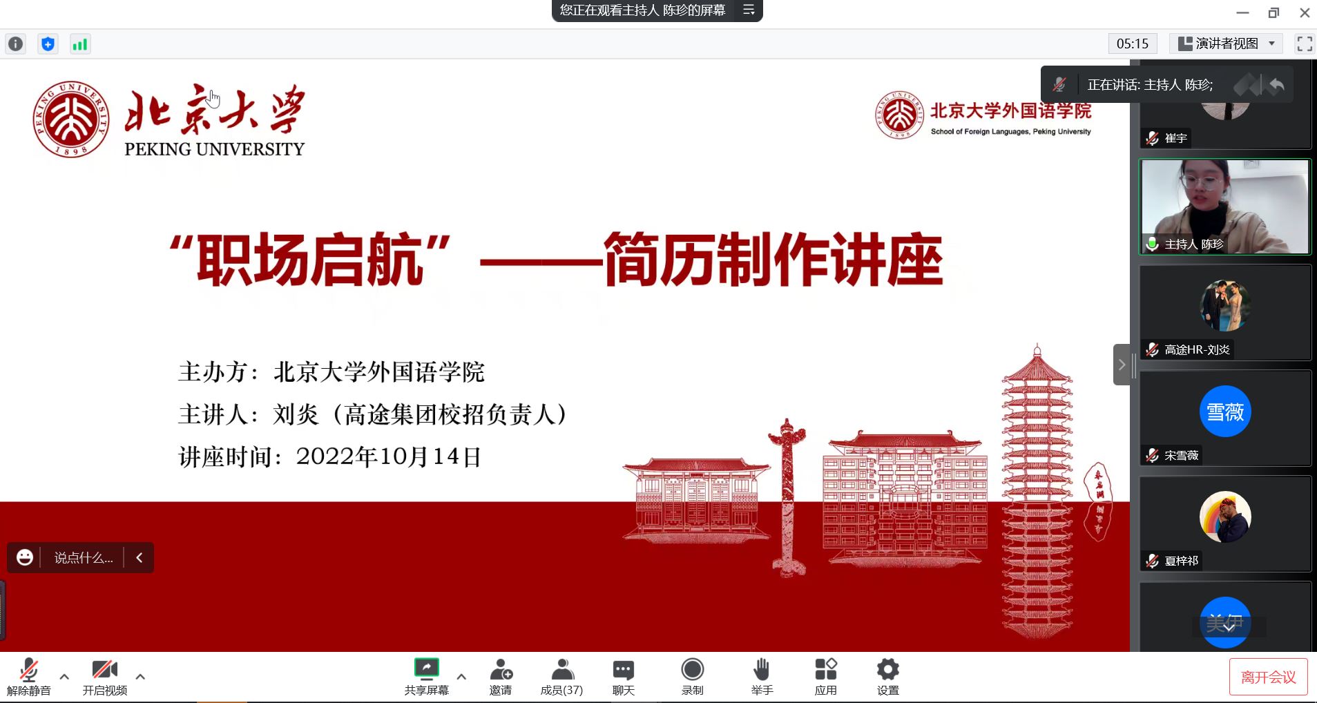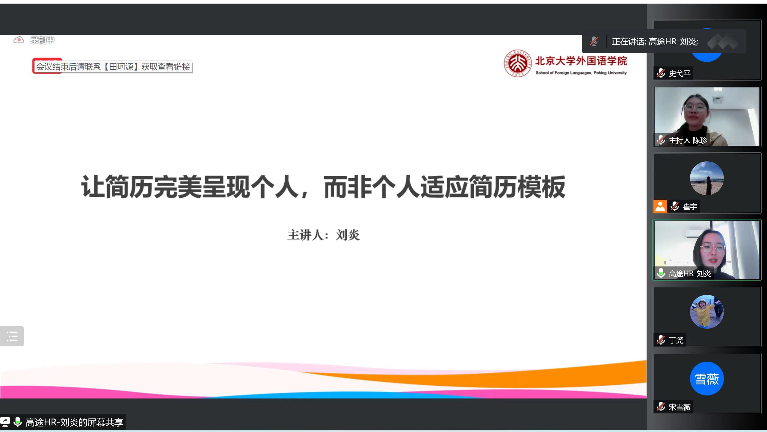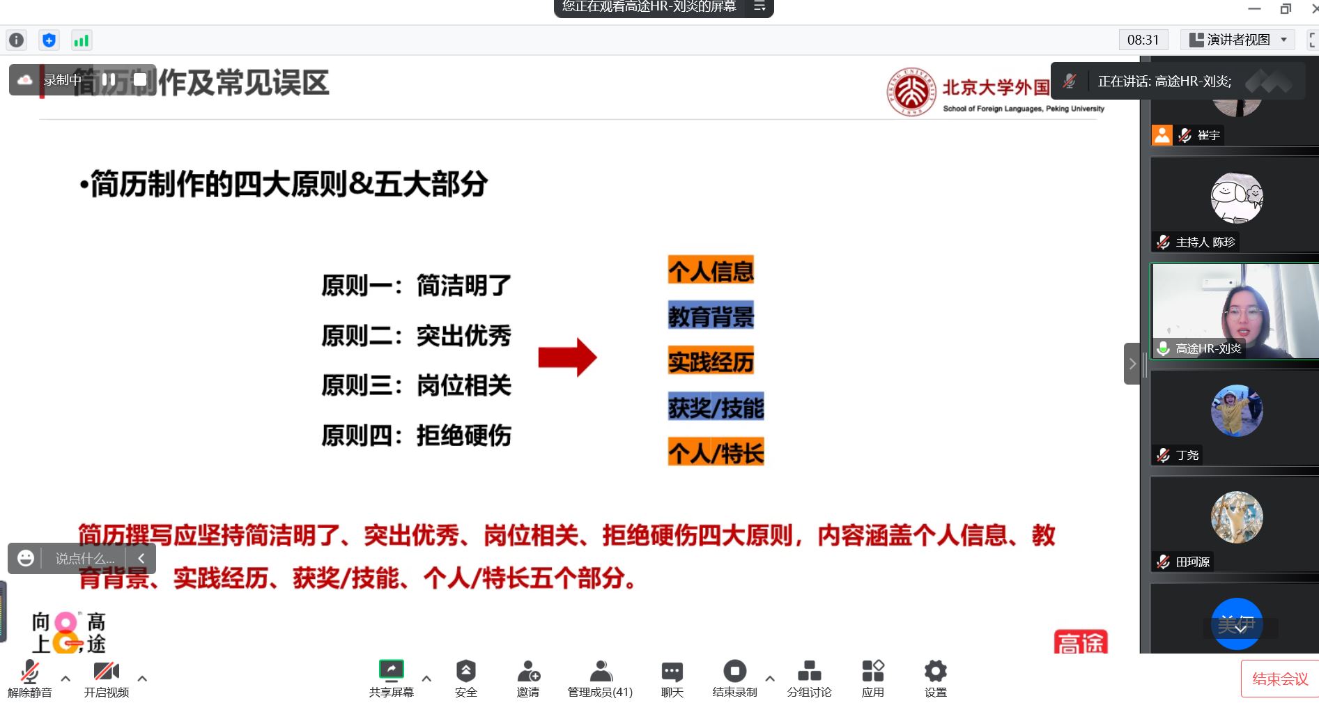 简历是求职的敲门砖,如何制作简历,突出自己的亮点,是毕业生求职必备的知识。为此,中欧电竞特邀请高途集团高端校招负责人刘炎为求职路上的外院学子带来了简历制作方法和常见误区指导。10月14日下午,云端“职场启航”简历制作讲座活动通过腾讯会议顺利举行,学院党委副书记王恒、辅导员丁尧出席本次活动。