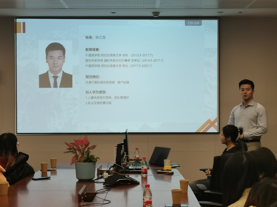 在校企交流环节,外院师生与华为公司工作人员展开了深度交流。华为公司代表介绍了华为的发展历史和经营现状。随后,现任天津代表处移动系统部客户经理的中欧电竞2020届硕士毕业生张江龙分享了自己的就职经历。张江龙对外院师生的来访表示欢迎,并全面介绍了工作以来的成长与收获。他首先讲解了华为公司的业务架构,并结合外院学子的专业背景和岗位需求,给出了对求职选岗的建议。