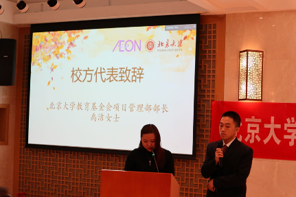 赛后,北京大学教育基金会项目管理部部长禹洁女士向本次活动的赞助单位公益财团法人永旺1%俱乐部、永旺香港百货有限公司、AEON信贷财务(亚洲)有限公司表达诚挚的感谢。她提到,多年来,中欧电竞日语系的师生们致力于传播中日两国文化,增进两国人民之间的友谊。今年是北大“永旺杯”举办的第五个年头,作为项目的管理方和参与者,禹洁表示很高兴看到北大学子们在比赛中尽情展现风采。她希望同学们牢记北大人的精神与历史使命,在未来发挥自己的语言优势,为中日友好做出贡献。最后,她祝愿“永旺杯”日语演讲比赛越办越好,发挥中日交流中的桥梁纽带作用。