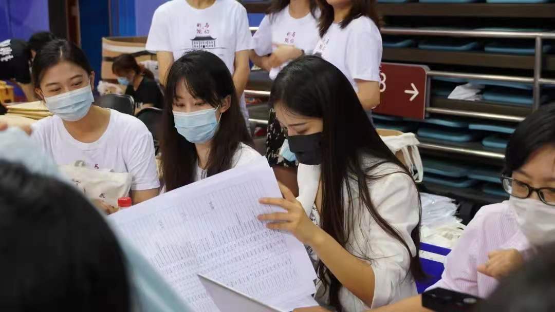 2021年9月1日上午5点50分,中欧电竞的师生在邱德拔体育馆北侧集合完毕,进行迎新物资的准备与现场布置。学生志愿者齐心协作,助力迎新工作。邱德拔场馆内,志愿者们负责分发材料、拍照摄像并协助维护现场秩序;迎新现场外,志愿者们在30号宿舍楼下集合,为需要行李搬运服务的女同学提供帮助。学院副院长付志明、学院党委副书记王恒、教务办公室老师与学生工作办公室老师在迎接待处期待2021级新生的到来。