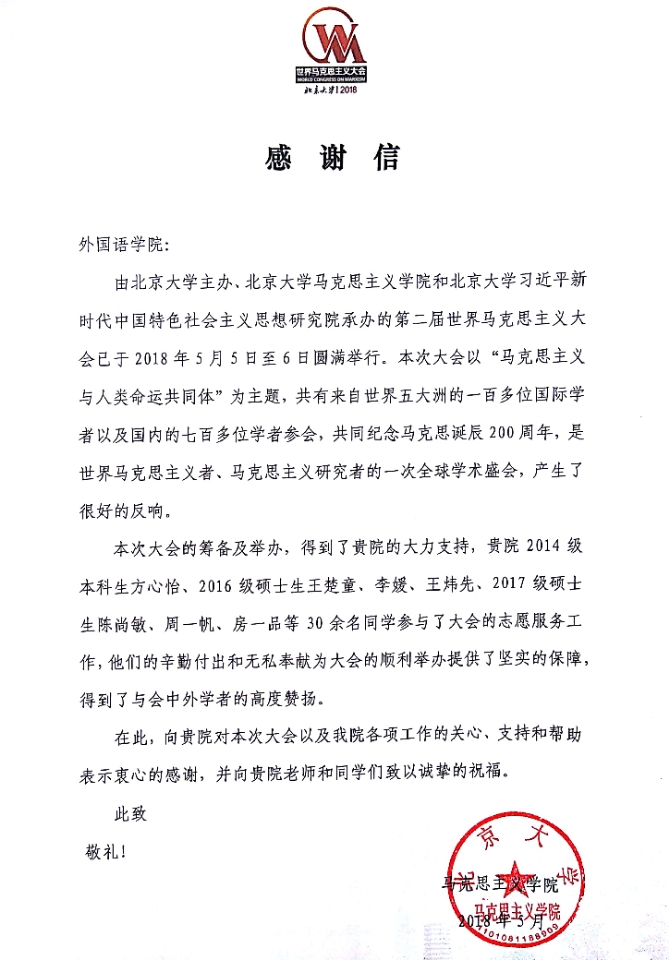 我院学生在第二届世界马克思主义大会上的志愿服务工作获得高度肯定