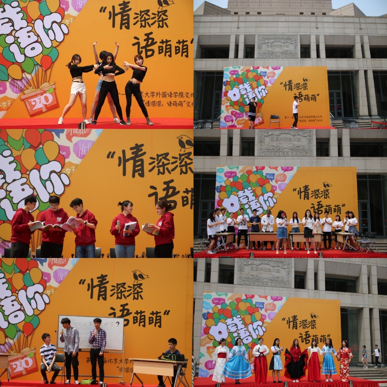 中午时分,来自外院各语系的同学,用“Show For Love”外院时装秀开启了文化节盛典。不同语系的同学身着世界各民族传统服饰,走上舞台,用异国歌曲和舞蹈展现了外院的多元文化背景。热辣的舞蹈与悠扬的歌声吸引了校园里的师生驻足观看,热烈的掌声将外院文化节的气氛推至高潮。外院学子不仅饱含青春活力,更心怀对当前和未来的思考。小品《我在外院学外语》以小见大,以活泼诙谐的方式展现了他们对外语专业的认知,体现了新一代外院青年的视野与担当。最后,外院同学用对自身专业的认同与热爱,唱响多语种版《燕园情》,将气氛推向新高潮,为本次文化节活动文艺表演画上圆满的句号。