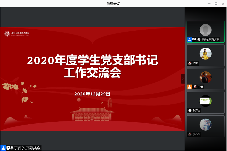 会议最后,李淑静老师充分肯定了本年度各学生党支部出色的工作表现,表示受疫情影响,本年度各支部坚持“线上+线下”的形式积极开展学习与特色活动,深度学习了党中央重要战略部署、重要会议精神,并结合自身专业特点开展了系列实践与志愿服务工作,充分展现出学习求知热情、社会实践热情与志愿服务热情,真正发挥了党建带团建的积极作用。李老师表示,在建党百年来临之际,院党委将大力配合好各位学生党支部开展系列党建教育活动,办好具有外院特色的支部活动,并叮嘱各位支书要继续绷紧防疫这根弦,持续做好支部基础性工作,不断增强党员党性修养,加强党员组织纪律性,以饱满的精神状态迎接建党100周年。