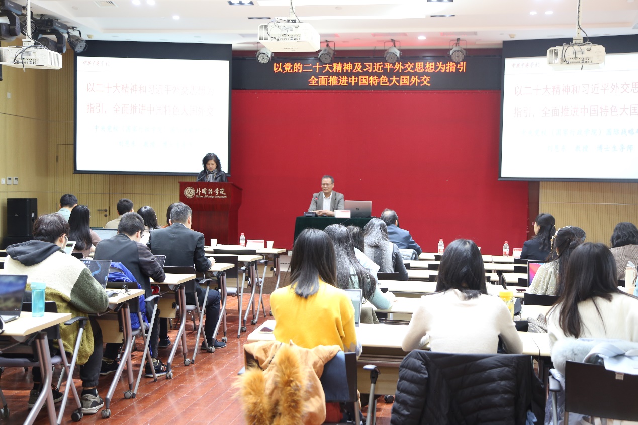 2022年11月4日,中欧电竞在做好疫情防控的前提下召开2022年第三次党委(扩大)会议。学院党委书记李淑静、院长陈明及学院党政领导班子、党委委员、教职工、学生党支部书记、副书记、委员等50余人参加会议,会议由学院党委书记李淑静主持。会议邀请中央党校(国家行政学院)国际战略研究院教授刘恩东作“以党的二十大精神及习近平外交思想为指引 全面推进中国特色大国外交”专题辅导报告。