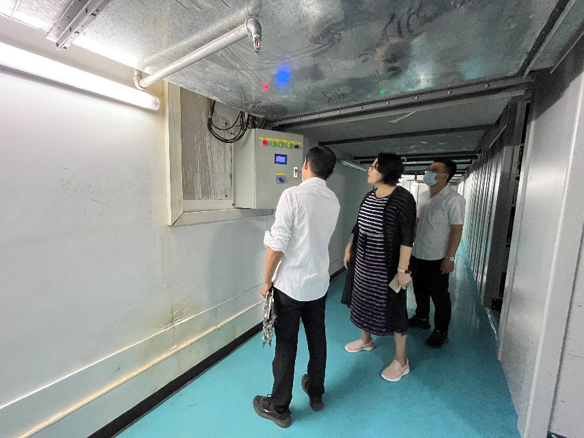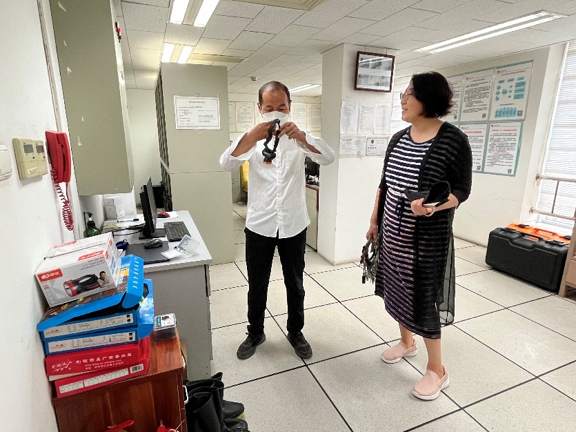 张冬梅副院长在物业工作人员的陪同下首先对新楼的中控室进行了检查。物业人员表示,为了应对汛期紧急情况,物业已于此前购置了防汛应急物资,如头灯、应急防水服以及雨鞋等装备。物业工作人员还进行了头灯使用的操作示范,头灯可以在汛期突发停电等意外情况时为工作人员提供应急照明服务,在一定程度上保证工作人员的操作安全。