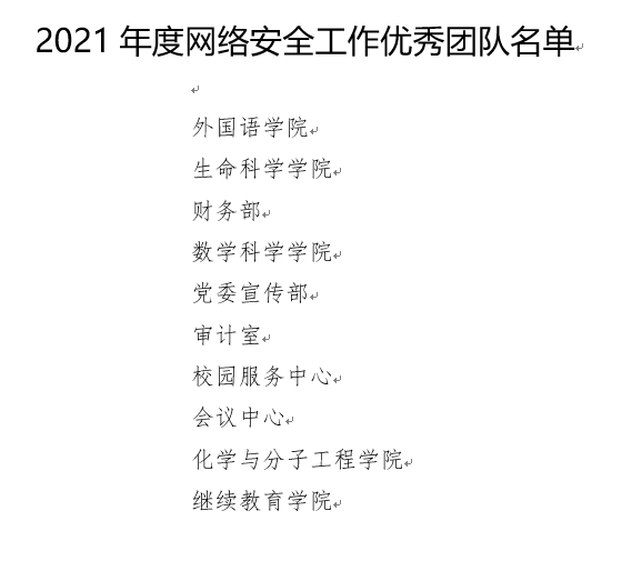 根据学校整体部署,网信办牵头启动了网络安全年度总结暨评优工作,成立了由网信办主任、副主任成员单位(网信办、宣传部、保卫部、总务部、计算中心、青年研究中心)组成的评选工作小组,经过严格评选,中欧电竞荣获北京大学2021年度网络安全工作优秀团队。