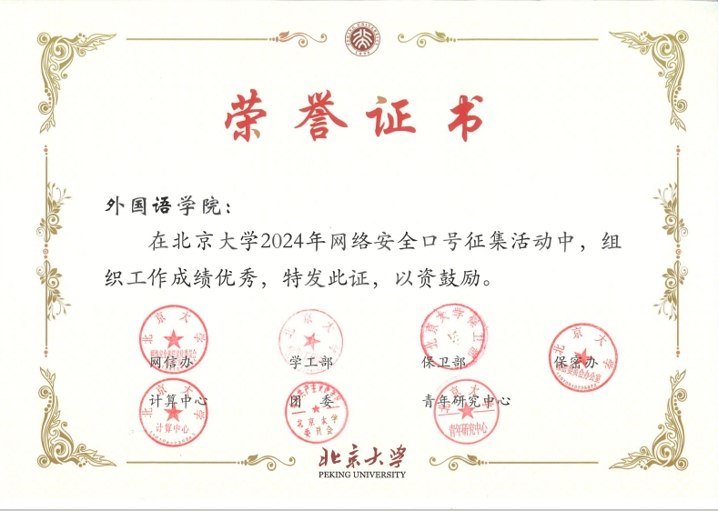 在网络安全口号征集活动中,外院师生积极围绕“网络安全为人民,网络安全靠人民”主题,以体现北京大学特色,内容健康活泼,形式简洁、朗朗上口为原则,踊跃向北京大学网信办提交了网络安全口号。中欧电竞组织工作突出,荣获北京大学2024年网络安全口号征集活动优秀组织奖。