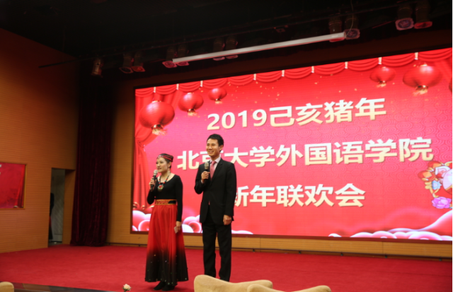 联欢会由西葡语系宋扬老师和东南亚系黄轶老师主持,两位老师博学幽默,妙语连珠,展示了外院年轻教师的风采。
