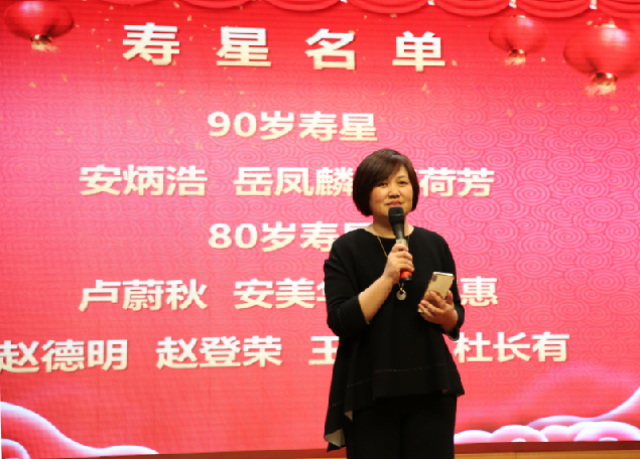 向年满80岁和90岁的老教师祝寿是外院历年联欢会的经典节目,今年外院共有7位80岁寿星和3位90岁寿星,老寿星们伴着《祝你生日快乐》的歌声缓缓的走上舞台,院务会全体成员一起为老寿星们送上代表喜庆和祝福的红围巾,并祝愿他们身体健康,心情愉快,福如东海,寿比南山!
